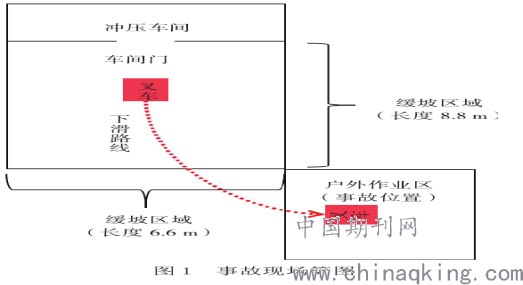 某公司一叉车在空车时发生滑动,将公司内一户外工作区域内正常工作的工人撞倒,造成该工人脚掌多处骨折,身体大面积擦伤,图 1 为事故现场简图。