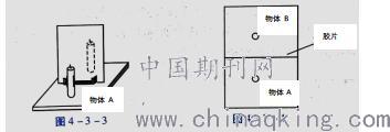 c、再拿另一个大小一样的物体B在胶片后移动,直到它与物体A的像完全重合,这时物体B所在的位置就是物体A像的位置,用笔记下两个物体的位置,其俯视图如图4-3-4所示