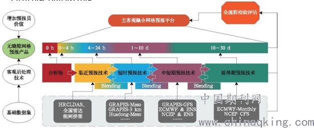 对多源观测、模式数据等进行综合利用,设计与发展了无缝隙精细化网络预报技术框架,如图1所示。