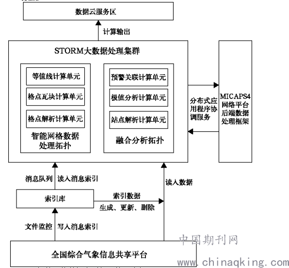 通常情况下,平台需要的气象站观测数据和智能网格数据均表现出时效性强、海量与异构等特点,以上数据在元数据提取、数据分析与处理等环节存在着较大程度的差异。MICAPS4网络平台后端数据处理系统为气象站点提供了雷达、卫星、数值模式等数据通用处理分析模块,然而却缺少智能网格数据加工处理与融合分析模块。而MOAP平台则主要使用了STORM分布式实时计算处理系统,并基于MICAPS4网络平台后端数据处理框架,构建了一套高效的智能网格数据分布式计算处理系统,以实现对智能网格实况预报数据进行一系列处理。由上图2可见为基于STORM框架的MOAP平台处理系统的实现流程。平台处理系统首先用于实时监督与管理消息,并采用消息队列的方式将监控结果存储在索引库当中。在实际工作当中,Redis为常用的消息索引存储库。基于STORM框架的 MOAP平台处理系统能够积极开发智能网格数据处理拓扑及融合分析拓扑。通过这两种方式实时计算分析的结果往往显示在数据云服务区,以满足浏览器的数据访问与分析等需求。