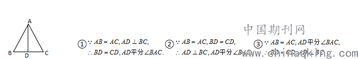 数学有着自己独特的符号体系和公式语言,数学思维的外显形式是数学语言的表达.当我们在提问学生,或者学生在解题的过程中,经常存在“只能意会,不可言传”的尴尬,归根结底,都是因为学生不擅于将文字表述转化为数学符号。因此,教师在教学过程中,要有针对性地解决这一问题。例如,教学等腰三角形的性质“等腰三角形顶角的平分线、底边上的中线及底边上的高线互相重合.”时,一定要结合图形,将这一性质的应用方法用数学符号表示出来:如图,