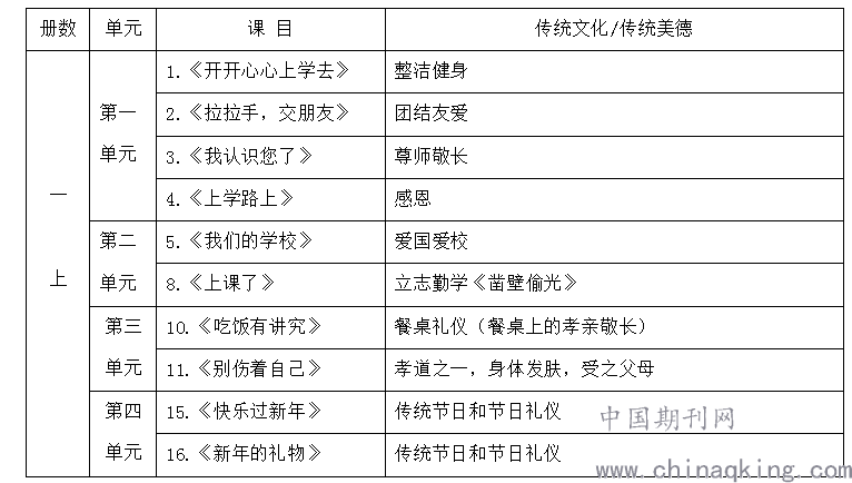 中华文化博大精深,中华美德源远流长。在小学低年级的《道德与法治》课程,融入了许多中华传统文化和传统美德的元素。经过仔细梳理,罗列出以下内容——