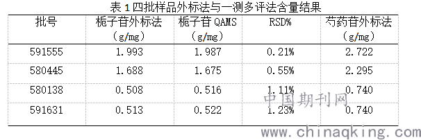 取4批颗粒照“2.3”项下方法处理,以“2.1”项下色谱条件下进行测定,分别采用外标法和一测多评法计算含量,所得结果无明显差异,同批次的含量及相对标准偏差见表1。
