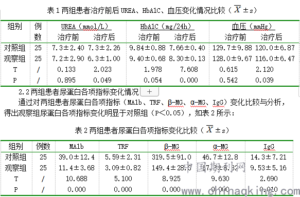 选取2020年1月~2021年2月来我院进行治疗的50例早期糖尿病肾病患者为研究对象,所有患者均符合早期糖尿病肾病,已经排除有泌尿系感染、严重心脑血管病及药物等引起的尿蛋白增多因素患者[2]。将纳入患者随机分为对照组与观察组,各组患者25例,其中,对照组男性患者12例,女性患者13例,年龄为58~82岁,平均年龄为(71.1±3.0)岁;病程为1~5年;而观察组男性患者15例,女性患者10例,年龄为57~80岁,平均年龄为(70.5±4.4);病程为1~6年。两组患者一般资料比较差异符合此次研究需求(P>0.05),可直接比较。