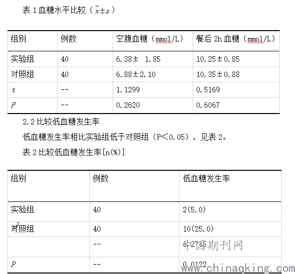 血糖水平应用()表示,组间对比行t检验;低血糖发生率[n/(%)]表示,组间对比行检验,所有数据处理应用SPSS23.0软件,统计学意义指标:P<0.05。