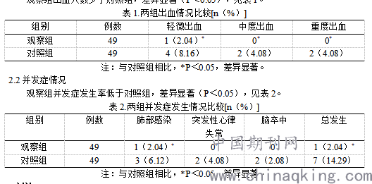 观察组出血人数少于对照组,差异显著(P<0.05),见表1。