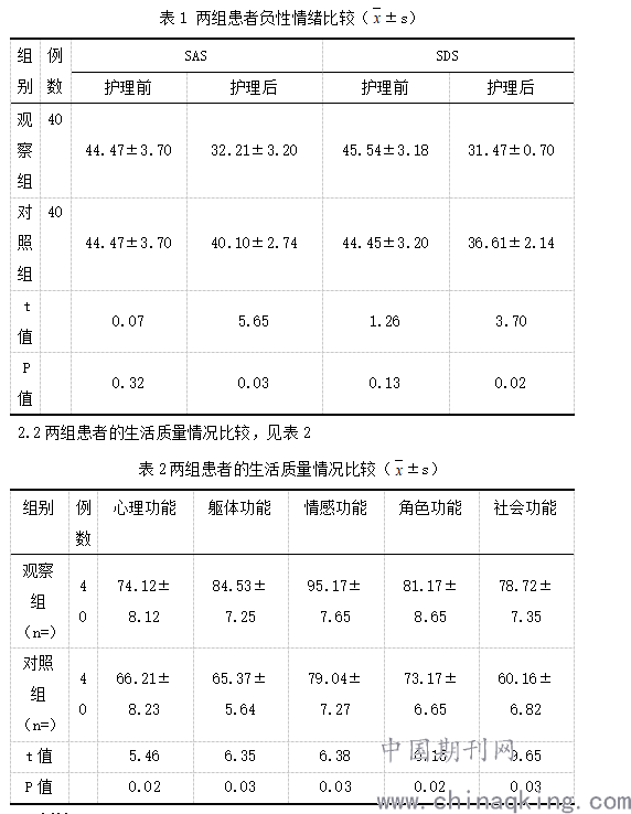 2.1两组患者负性情绪比较,见表1