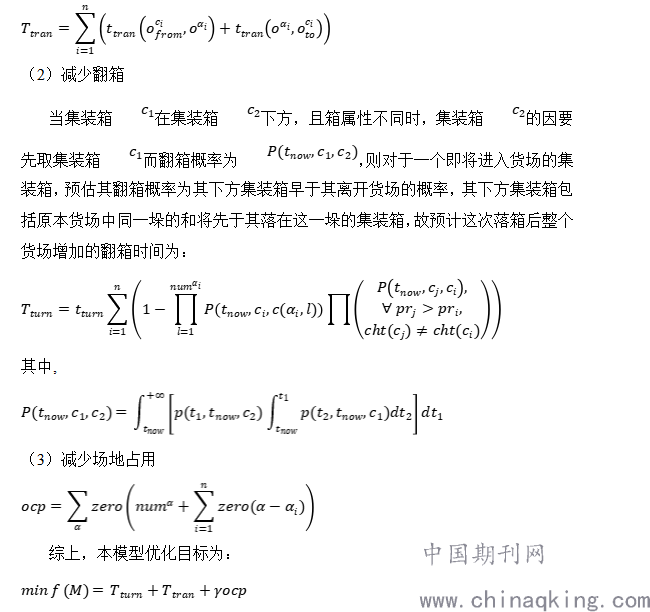 对于箱位分配策略的研究,主要集中于作业成本的最小化,而不同的研究中采用了不同的目标函数来表征作业成本。在不同的堆码模型中,分别定义了堆场的叠压度、自由度、翻箱量等概念,用于权衡堆垛作业中的作业成本。江南等 [1]通过划分堆场集装箱集合,建立了静态码垛模型;关于集装箱的对方顺序定义了全序关系,建立了动态的码垛模型,并设计了对应判定、码箱、取箱算法;再考虑取箱时暂扣空箱,建立了循环箱码垛模型,设计了对应码箱、取箱算法。王金红 [2]首先根据运输货物性质划分箱大区,根据物流情况和常见货主划分箱小区;其次,提出大宗货物自由度与零散货物叠压度的定义;在之前基础上,建立了大宗货物集装箱码垛模型和零散货物集装箱码垛模型,设计了堆垛算法,并验证了算法的可行度。谢颖 [3]考虑了翻箱的原因、对作业成本和效率的影响,归纳了降低翻箱量的策略,建立了以码箱取箱成本最低为目标的码箱箱位优化模型,并通过模拟仿真验证了模型的可行性。