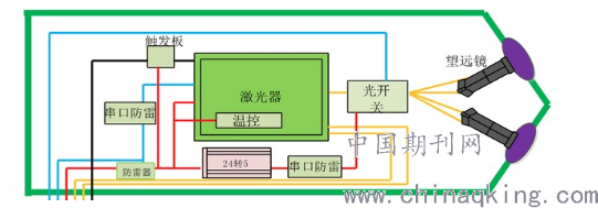 所有与外界相同的接头全部使用优质防水、防尘接头。内部布局要求简单,占空间小,方便操作,如图2-4所示,光学发射器布局原理示意图。