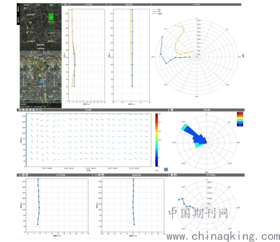 经过大量的系统调试工作和不断地实验,应用软件组开发的采集软件,最终得到风场的实测数据,完成了数据实时采集显示,风场数据包括:水平风速、垂直风速、水平风向、风羽图和风玫瑰图等,如图3-5,软件采集实测显示图。