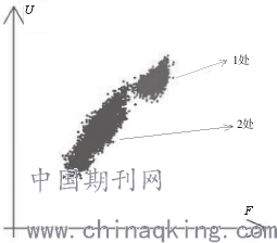 检测系统是基于不同介质通过微波装置的谐振腔时,微波谐振信号的谐振频率和谐振幅度发生变化来进行检测的。在通过微波装置的谐振腔部位时,会随机产生微波谐振信号,对其进行信息数据分析和比对研究后,可以从微波谐振信号的变化中明显分辨出A段材质滤棒与B段材质滤棒。分析结果如图1所示。图1中,U表T微波谐振曲线振幅,F表T微波谐振曲线频率。1处表示A段材质滤棒产生的微波信号,2处表示B段材质滤棒产生的微波信号。