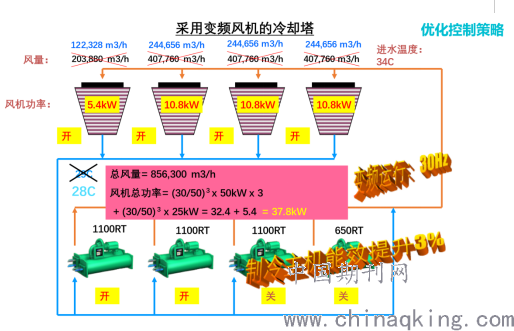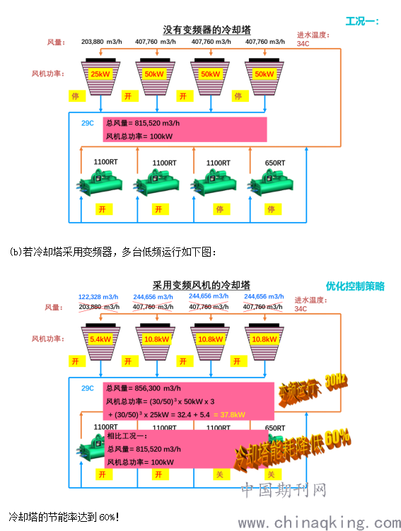 (2)多台变频冷却塔运行时,不宜采用冷却塔与主机的一一对应运行。要运行多台冷却塔,而且冷却塔风机低频运行。这种方式效率更高,节能明显。