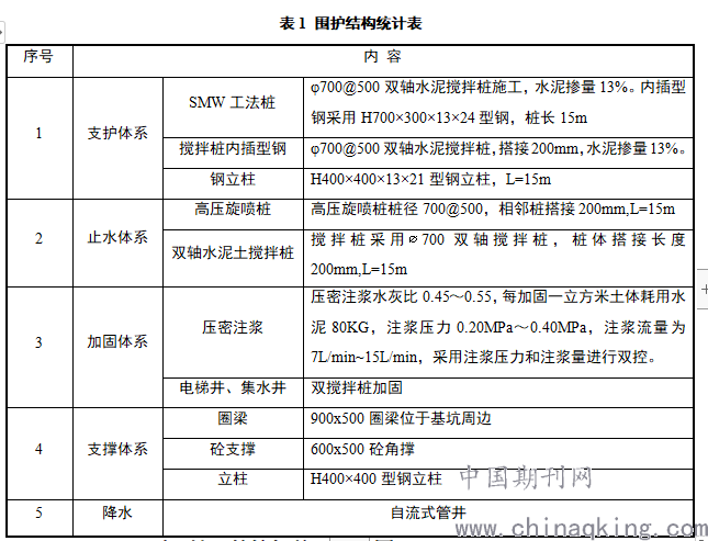 本工程基坑采用双轴水泥土搅拌桩重力坝悬臂支护,局部采用双轴搅拌桩内插H型钢工法结合前撑注浆钢管支撑。围护结构具体设计情况详见下表: