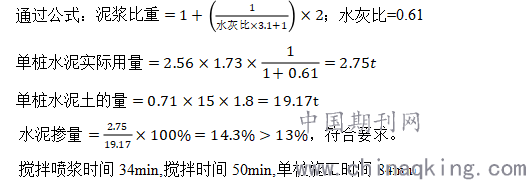 搅拌喷浆时间34min,搅拌时间50min,单桩施工时间84min
