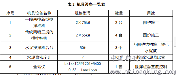 案例工程两台一喷两搅新型搅拌桩机2台,传统两喷三搅的搅拌桩机4台、水泥搅拌机后台3台施工过程中用到水泥浆密度计,全站仪、秒表、钢卷尺的工具,主要的机具设备详见下表。