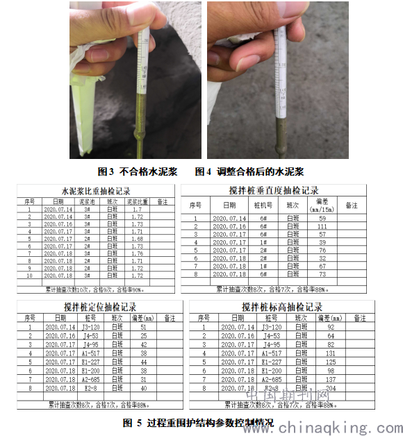 水泥浆的密度时影响搅拌桩质量的重要因素,因此施工单位安排专业工程师测量水泥浆比重,如果出现不合格及时通知专业队伍调整。项目规定白天测量三次水泥浆比重,晚上值班同样测量三次,在项目工作群里汇报情况。双轴搅拌桩的垂直度、标高、定位也按同样的规定控制。并安排技术工程师做抽样检查。