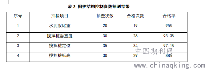 案例工程目前基坑工程已经完成,双轴搅拌桩组成的重力坝未出现超出规范要求的变形,未出现漏水影响基坑工程的其它分项的施工,案例工程的重力坝上设计的是压顶路面,过车后基坑围护结构也没有出现报警,符合设计的要求。围护结构的取芯检测,28天无侧限抗压强度满足设计要求。