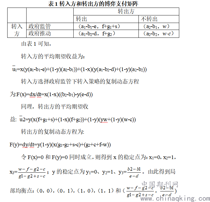 根据以上假设构建转入方与转出方博弈支付矩阵,如表1。