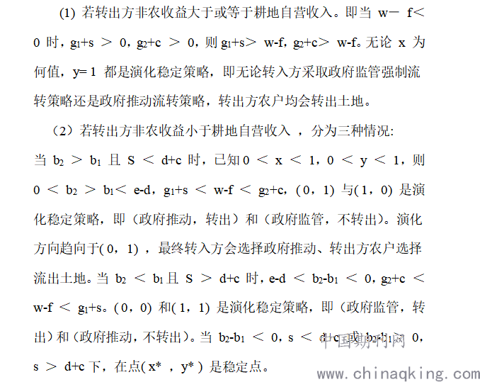 摘要:利用演化博弈模型分析农地流转转出方与转入方的行为选择。通过稳定均衡策略的结果表明,非农就业受益、自营耕地收益是影响农户行为策略的根本因素,政府的监督管理,支持力度以及政策性补贴是推动农地流转,促进农地规模经营的手段,同时,土地市场价格的稳定是农地流转市场稳健发展的保障。因此要进一步鼓励土地流转,完善土地流转机制,降低交易成本,完善土地价值评估体系,政府在适当给予财政补贴的同时,加强农地流转市场的监督管理。