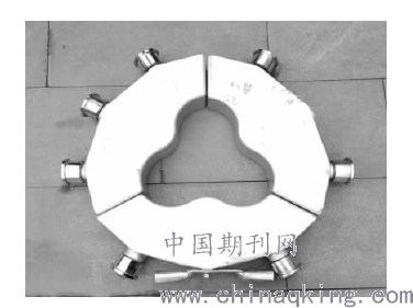 根据设计要求和现场实际情况,清理一条正对钢管长约50m~70m的直线通道,通道内架设A,B,C三相电缆大盘架设,电缆大盘品字形排列。钢管一端至每个大盘间各固定4台电缆输送机,钢管的另一端设一台牵引机,牵引机与输送机同时工作,提供电缆敷设动力。当电缆进入管道内部前,每隔5m固定一副圆环形移动电缆抱箍(见图4),抱箍带着电缆在钢管内部轴向滑动,直至完成整根电缆的敷设。电缆进入管口时保持电缆头平直,如有弯曲采用电缆校直机进行校直。