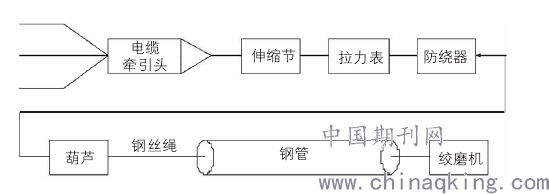 首先采用水平定向钻技术铺设D790mm14mm钢管,包括导向、扩孔、回拖等流程。钢管铺设完成后,需对钢管内壁用氧气进行吹扫,清除管内的障碍物和其他杂物及毛刺,确保管内畅通无阻。同时在气密条件下,利用空气压缩机产生的高压气体将连接有6mm钢丝绳的活塞穿过钢管,然后依次连接绞磨机、葫芦、防绕器、拉力表、伸缩节及电缆牵引头(见图3)。
