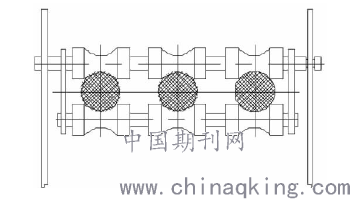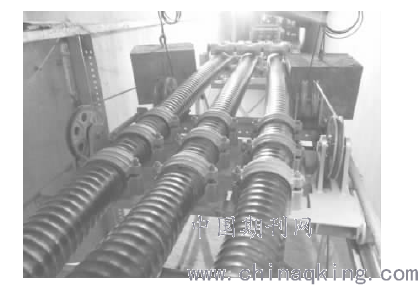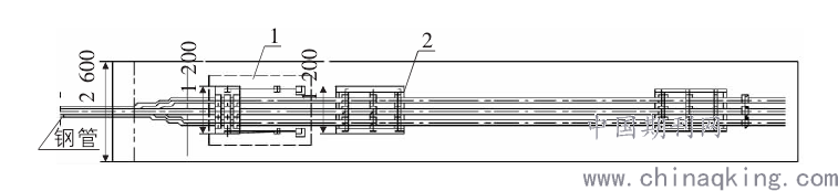 补偿段滚轮装置(图10,图6,图7中标记2)由上下两组滑轮组成,上侧可滑动滚轮通过螺杆与竖向立杆固定,具有一定下压力。当电缆穿过上下两组滑轮时能够向下弯曲,通过调节上下滑轮的间隙使得电缆的变形在一个比较固定的区域内。