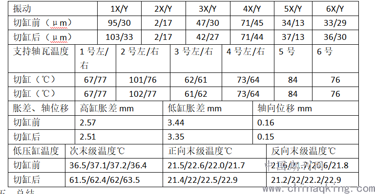 选取典型工况下切缸前后参数对比可知除次末级温度在可控范围内明显升高外,其他参数变化不大,运行参数平稳: