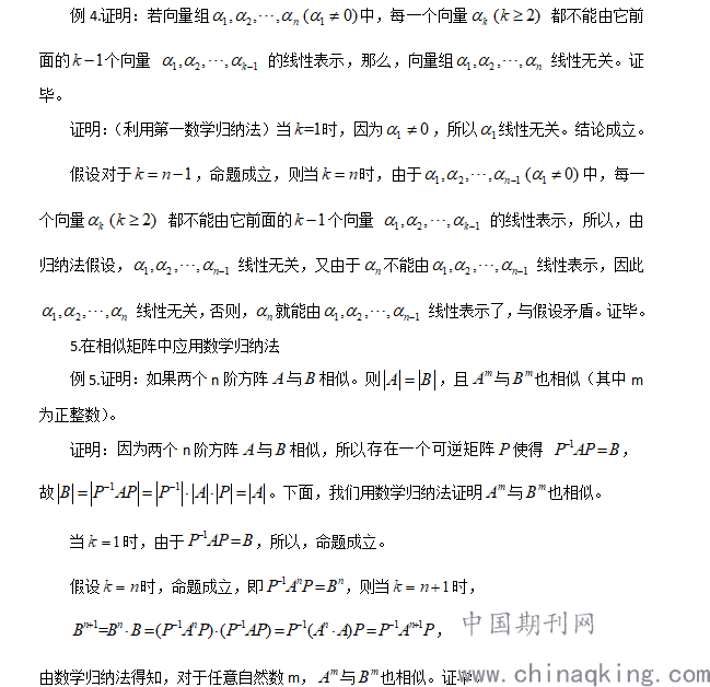数学归纳法在线性代数中还有许多应用,比如数学归纳法在矩阵的初等变换中的应用,在二次型中的应用等等,由于篇幅所限,我们并没有把数学归纳法在线性代数中的应用一一列出。因此,在教学中,应当重视数学归纳法的应用,使学生理解数学归纳法的原理,掌握数学归纳法的方法与 步骤,提高数学运算能力及分析和解决问题的能力,从而达到提高教学质量的目的。