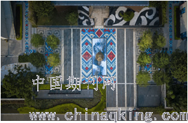 入口以艺术感铜鼓及景墙中庭,以中式园林建筑风格为主调,采用了徽派民居中“四水归堂”与中轴对称的设计格局。明堂内外皆为庭院,将典型的壮乡风格及纹样融萃空间其中,将景观带集中引向中轴线之上的镂空绣球雕,满地壮锦(景),绿荫漫野,“一院纳宝”(如图 30),华彩而恢弘的序章引导来访者进入迎客前堂(传统建筑中的倒座)。