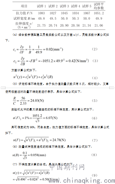 对于水利工程中的质量检测工作而言,目前,相关部门还没有针对测量不确定度给出具体的要求,但对于检测机构而言,能否应用合理的方法对测量结果中的不确定度进行评定是判定其资质能力的重要依据,因此为了更好地适应激烈的市场竞争,还需要检测机构结合实际情况对相关评定方法进行说明。对于评定测量不确定度的程序具体如下所述。首先,要对数据测量的主要目的加以明确,要清楚自身通过测量工作想要获得怎样的结果,并在此基础上结合实际测量条件和环境建立计算模型,同时要分析测量参数以及最终测量结果间的关联性,借助相关测量设备将测量准备工作做好,且在测量期间要将相关因素的影响有效降低。其次,要结合测量数据结果计算各测量数据对应的测量不确定度,最终获得测量数据整体的不确定度。再次,结合上述环节获得的测量数据和相应的测量不确定度,完成测量数据的分组工作,并分析数据间的关联性,若存在关联,还需要使用相应的数据信息及计算方法分析各组数据间的误差以及测量不确定度,并使用之前的测量参数,获得相应的测量结果,同时为各组赋予相应的权重,之后才能对测量不确定度进行综合计算,进而获得整体的测量不确定度。从次,要分析影响测量数据的相关因素,明确各因素间的联系,并确定其可信度,这个过程需要详细记录,同时要与相关人员讨论,对于存在问题的地方需要及时进行处理,使测量数据评估能够更加准确。最后,可以结合之前的记录调整实验设备,做好固定误差的校正工作,将测量不确定度有效降低,进而达到提高测量数据质量的目的。针对上述操作程序,文章结合水利工程中较为常见的无纺土工布进行了具体说明。(1)对于无纺土工布,可以通过数学模型的设置对其拉伸强度进行测试。具体模型为