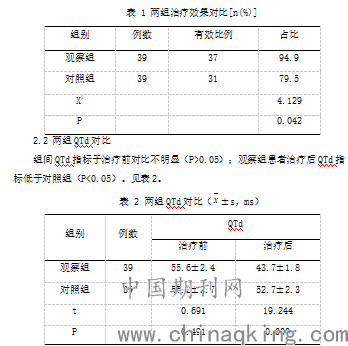 对比两组治疗效果,以患者室性早搏及成对室性早搏改善90%及76%以上为有效;对比两组患者QTd变化,实施12 导联同步心电图(ECG)监测。