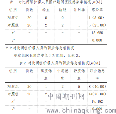 评估对比两组护理人员医疗期间医院感染率情况,包括有输血、输液及注射器感染等;并采用本院自制问卷调查,对比两组护理人员的职业倦怠感情况。