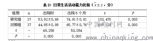 研究组的日常生活活动能力在出院时、出院5个月均高于对照组,(P<0.05),见表2。