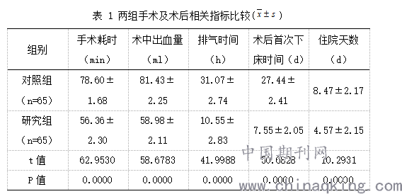 对两组患者手术所需时间、手术过程中的出血量、术后首次下床时间、排气时间、住院天数进行统计,并予以详细记录。