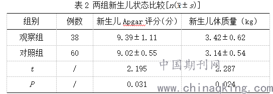 与对照组新生儿Apgar评分和新生儿体质量相比,观察组均偏高,组间差异明显(P<0.05)。详见表2。