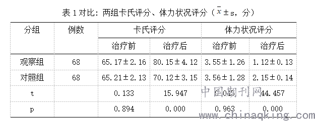 治疗前两组卡氏评分、体力状况评分对比无统计学意义(P>0.05);治疗后,观察组卡氏评分显著高于对照组,体力状况评分显著低于对照组,差异有统计学意义(P<0.05)。见表1: