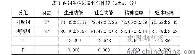 观察组比对照组各项生活质量评分更高,差异明显(P<0.05),见表1。