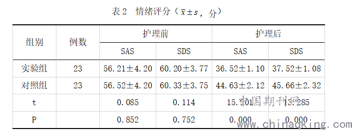 护理前两组情绪评分无明显差异(p>0.05);护理后差异明显(p<0.05)。见表2。