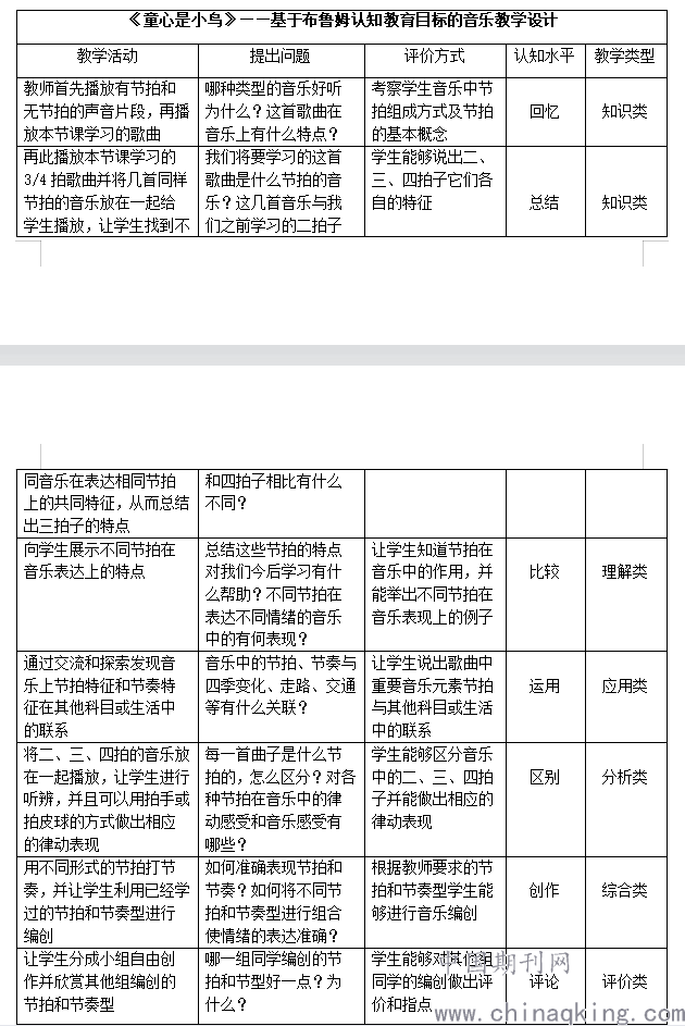 笔者选用这一课作为案例的原因首先是四年级处于小学阶段中的中间阶段,学生的年龄是比较适中的,并且在这一课中是第一次出现了3/4拍这种三拍子的形式,和之前学习的二拍子或四拍子有相似却不同的地方,这就要求学生对三种类型的拍子进一步认识和了解,同时它和五六年级将要所学的3/8拍相比又会稍稍简单一些,难度也是比较适中的。接下来,笔者将《童心是小鸟》整节课指向布鲁姆认知教育目标的教学设计通过表格的形式将每一步列举出来。