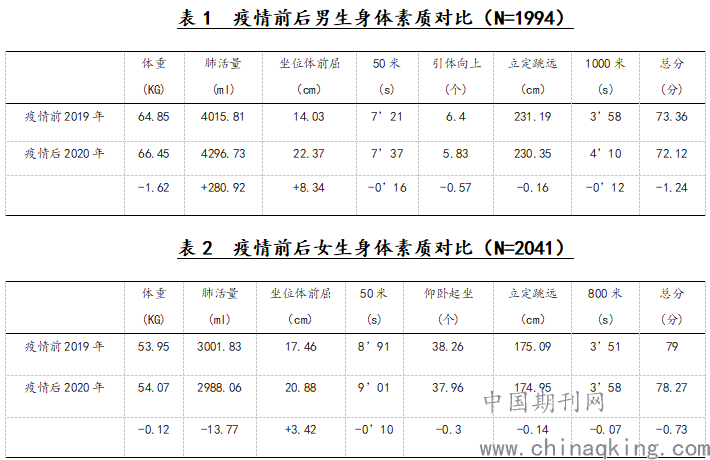 2020年初“新冠病毒”爆发,涉及全球。为避免集中交叉感染,所有学校延期开学。为了阻断疫情向校园蔓延,确保师生的生命安全和身体健康,国家教育部先后下发文件,各个层面的学校要求 2020 年春季学期延期开学,学生在家不能外出、不能聚会、不能参加聚集性活动,响应国家号召。各省教育部门相应的推出应对措施“停课不停教,不停学”。各高校也相应推出了种种措施应对疫情,把在线教学做到更好。浙江理工大学进行了12周的体育网课指导授课,4周返校后进行7项身体素质测试评定。体育教学有其特殊性。它是以身体活动为主的一门实践性非常强的教育。不但需要场地和设施作为基础保障,而且需要适当的接触式指导,才能帮助学生准确掌握动作技术要领和增强肌肉的本体感受。虽然疫情期间教师进行了网络课程指导学习,线上学习同学们在自律性、自觉性及能动性方面差异明显,最终锻炼效果一般。再经过一学期线下体育课程的锻炼,在教学过程中,大学生的锻炼的主动性和积极性因为疫情的原因也有所下降。本文通过疫情前后大学生体质测试数据的分析比对,试图核实大学生身体素质的真实情况,为学校今后体育工作的开展提供数据支持。