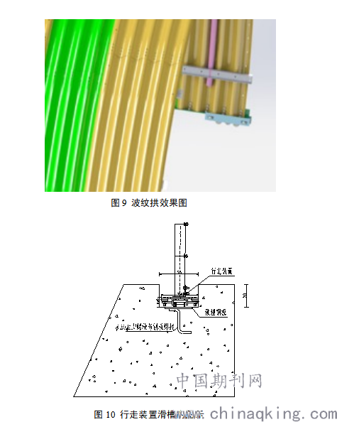 卷扬机牵引波纹板直到与上一个安装好的波纹板单元处,单元之间使用法兰连接。注意在用卷扬机牵引波纹板时,在波纹拱单元下面的角钢上行走装置外侧布置有支撑滑轮,以防止在滑移过程中波纹拱变形,如图9所示。