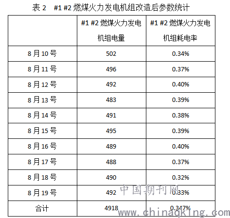 结合表1和表2可以看出,#1 #2燃煤火力发电机组参数发生了明显变化。其中,改造前#1 #2燃煤火力发电机组平均每天所消耗电率为0.545%,三个月后,#1 #2燃煤火力发电机组平均每天所消耗电率下降了0.198%。按照这个标准,我公司每月将会节约出2.5-2.6万元,全年节约费用将在30万元以上。