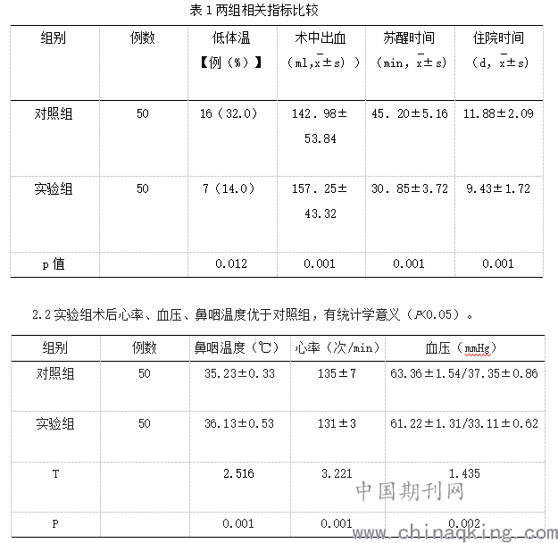 1.3 观察指标观察两组患儿低体温发生人数、苏醒时间、住院时间;术中血压、心率、鼻咽温度。