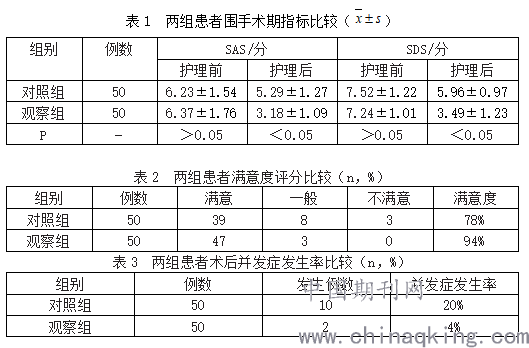 统计两组患者SAS、SDS评分、患者满意度等指标参数,根据所得数据,对两种护理方式临床疗效进行对比,得出结论。