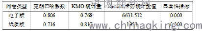 信度反映了调查问卷的可靠性、稳定性和内部一致性,经过软件计算,电子版、纸质版调查问卷各组及其全部题项的克朗巴哈系数()均在0.7以上(见表1),说明问卷的可靠性、稳定性和内部一致性较好,可信度比较高。