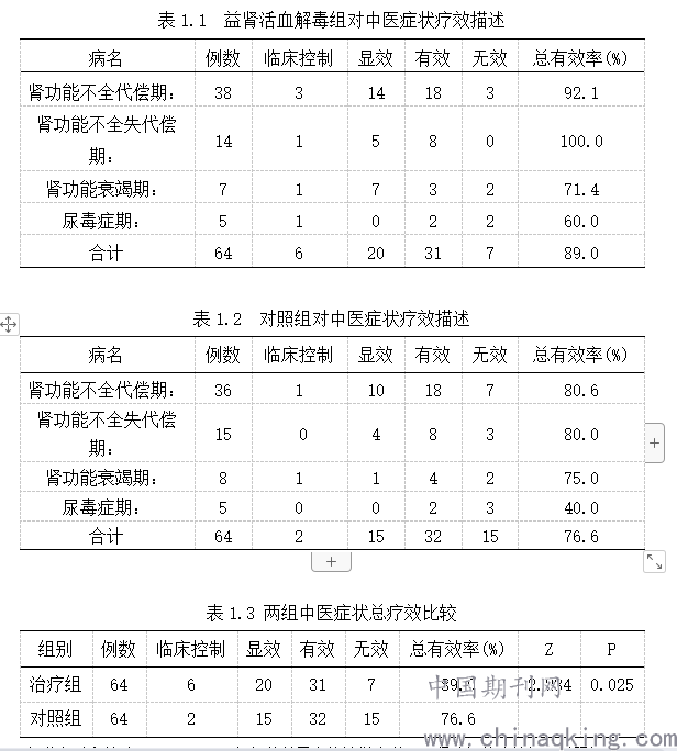 统计各组病例的慢性肾功能衰竭相关指标的改善情况、中医症候疗效及临床疗效,并进行同组治疗前后及组间比较。通过此研究课题,研究益肾活血解毒汤治疗慢性肾功能衰竭及其相关指标的改善情况,并观察其安全性。