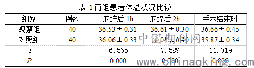 对照组实施常规管理包括:(1)手术室温度:保持22~25℃;(2)液体:进入患者体内血液制品或液体应加温;(3)肢体:使用加温棉垫遮盖暴露部位。