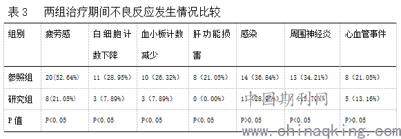 研究组患者发生疲劳感,白细胞计数降低,血小板减少、肝功能损害、感染,周围神经炎及心血管事件等不良反应率低于参照组,比较差异有统计学意义,P<0.05。