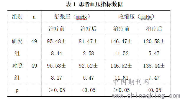 治疗前,所有患者血压数据无统计学差异。治疗后,研究组患者的血压指标数据低于对照组,P<0.05。表1为患者血压指标数据。