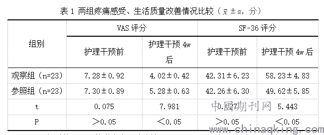 护理干预4w后,比较两组疼痛感受、生活质量改善情况,并比较两组对护理干预的满意度评价。其中,疼痛感受以视觉模拟评分法(VAS)进行评分,总分10分,分值0分为无痛,1~3分为轻微疼痛,4~6分为中度疼痛,7~10分为重度疼痛;生活质量以SF-36生活质量评价量表进行评价,总分100分,分值越高表示生活质量越好;满意度评价以我院自制满意度评价问卷评估,总分100分,分值越高表示满意度越高。